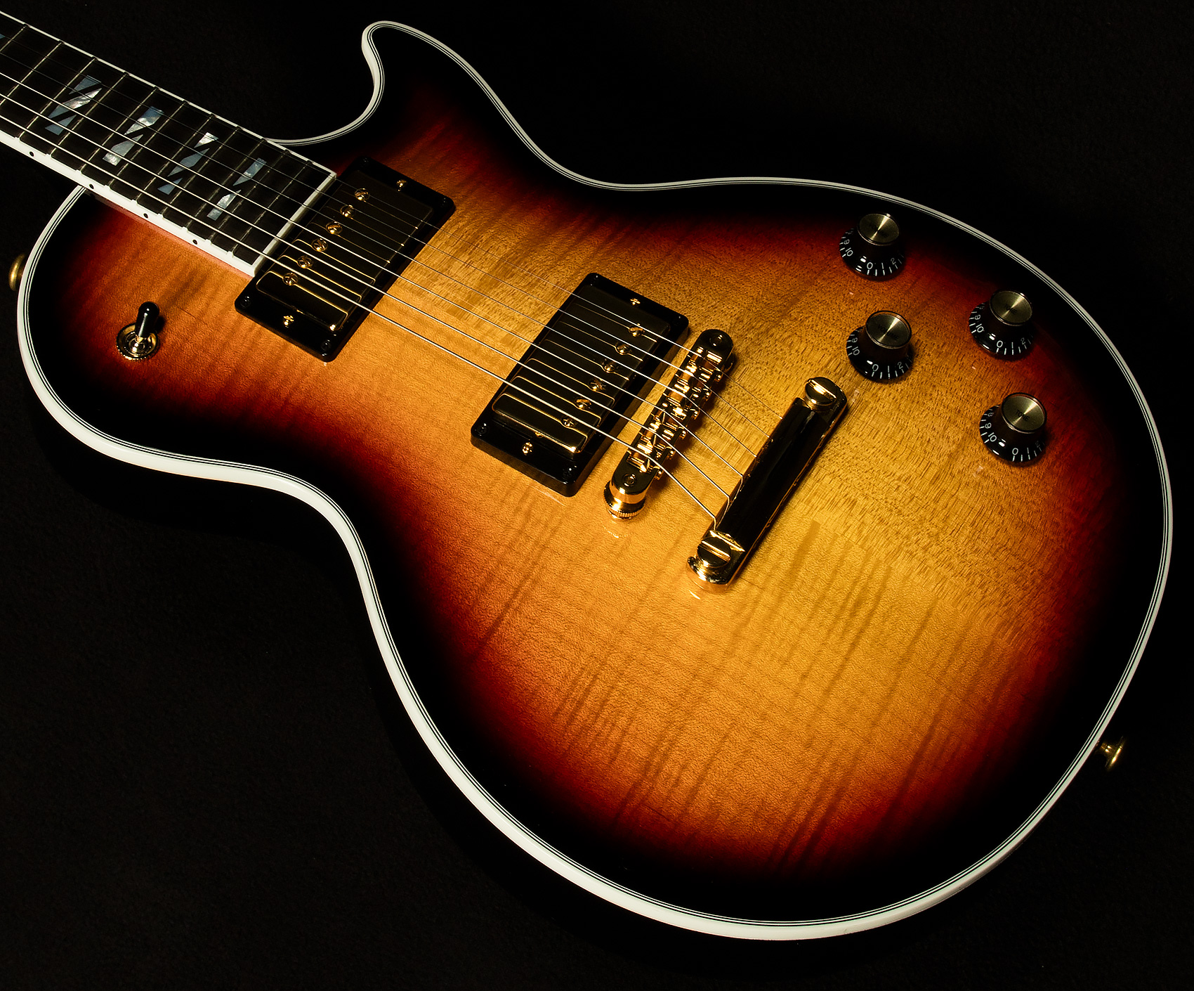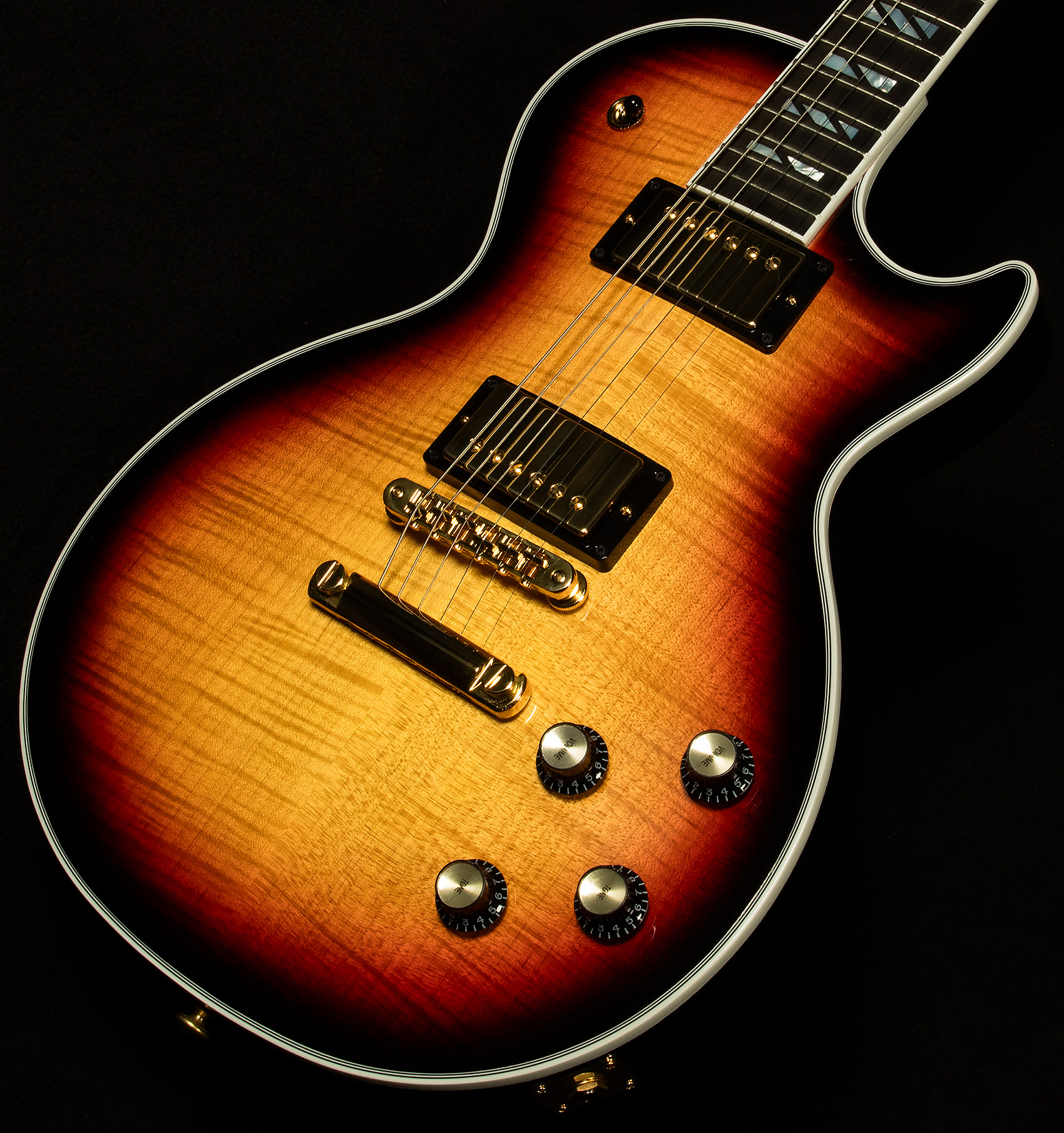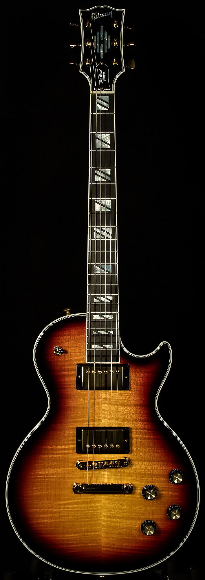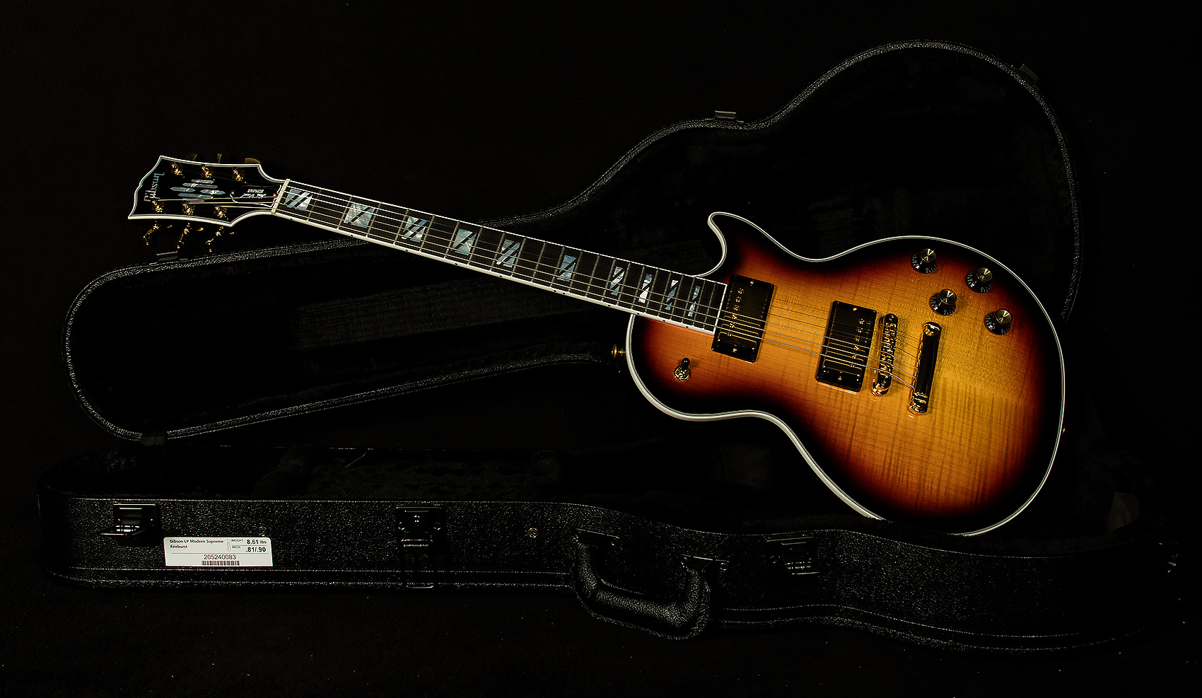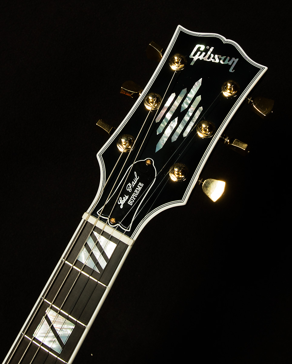 Gibson is excited to announce the return of the Les Paul Supreme. With a refreshed feature set, it is bound to overshadow everything else in sight and be one of the most exciting new releases of the year. It features a beautiful AAA-figured maple top on a mahogany body with Ultra-Modern Weight Relief. The mahogany neck has an ebony fretboard with a compound radius and Super Split Block mother-of-pearl inlays. The neck has a Modern Contoured Heel for exceptional upper fret access, and the headstock is adorned with a striking new mother-of-pearl inlay inspired by a design from the 1940s that was discovered in the Gibson archives. The Burstbucker Pro and Burstbucker Pro + pickups are paired with push/pull Volume and Tone potentiometers for flexible coil tap, phase, and Pure Bypass switching. The three gorgeous finishes are elegantly highlighted with gold hardware, making this not only a great-sounding and highly flexible instrument but also an exceptionally beautiful-looking modern rock machine. A hardshell case is also included.