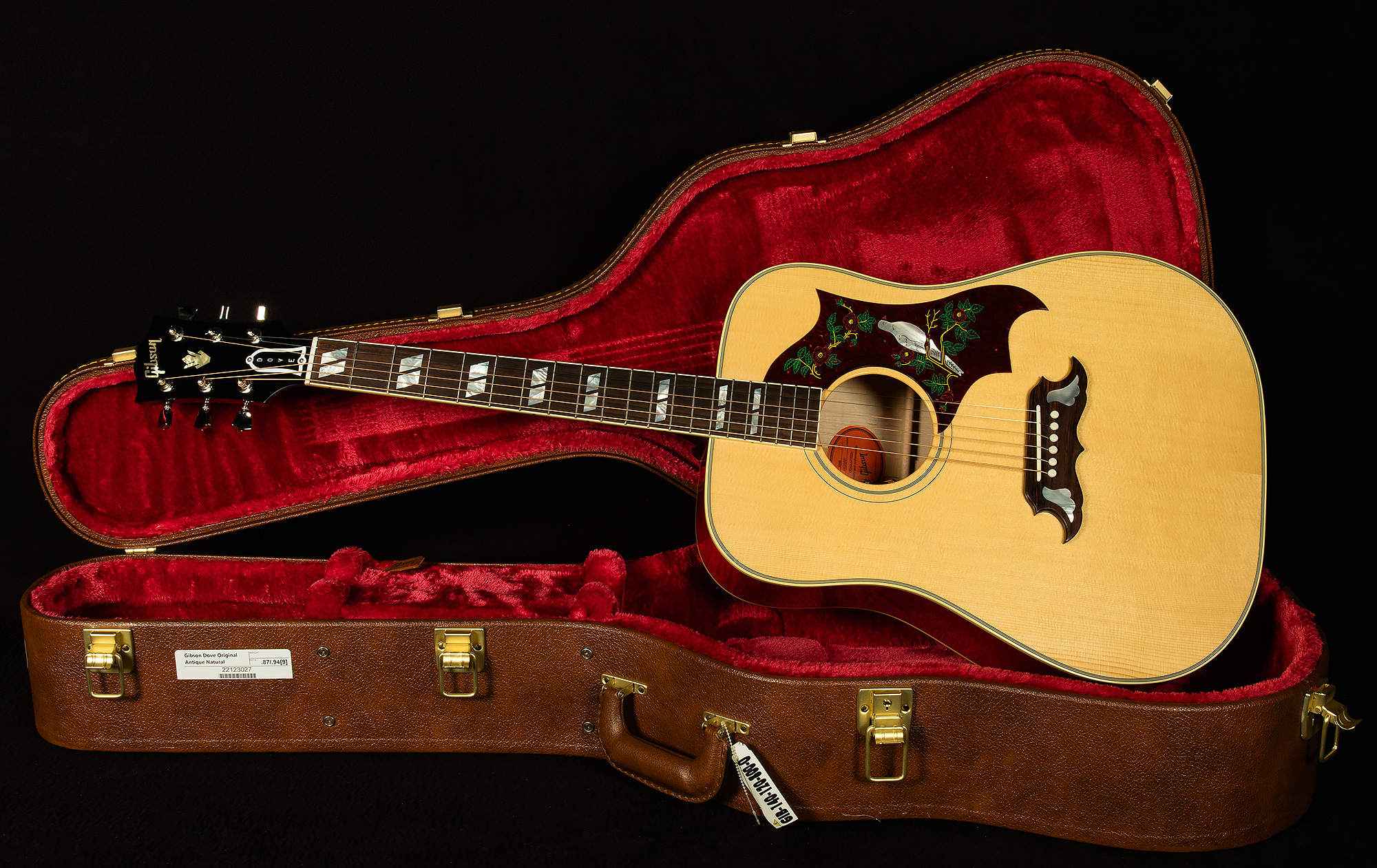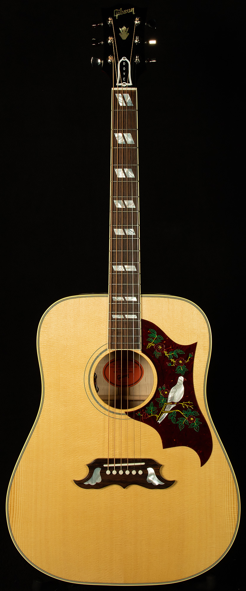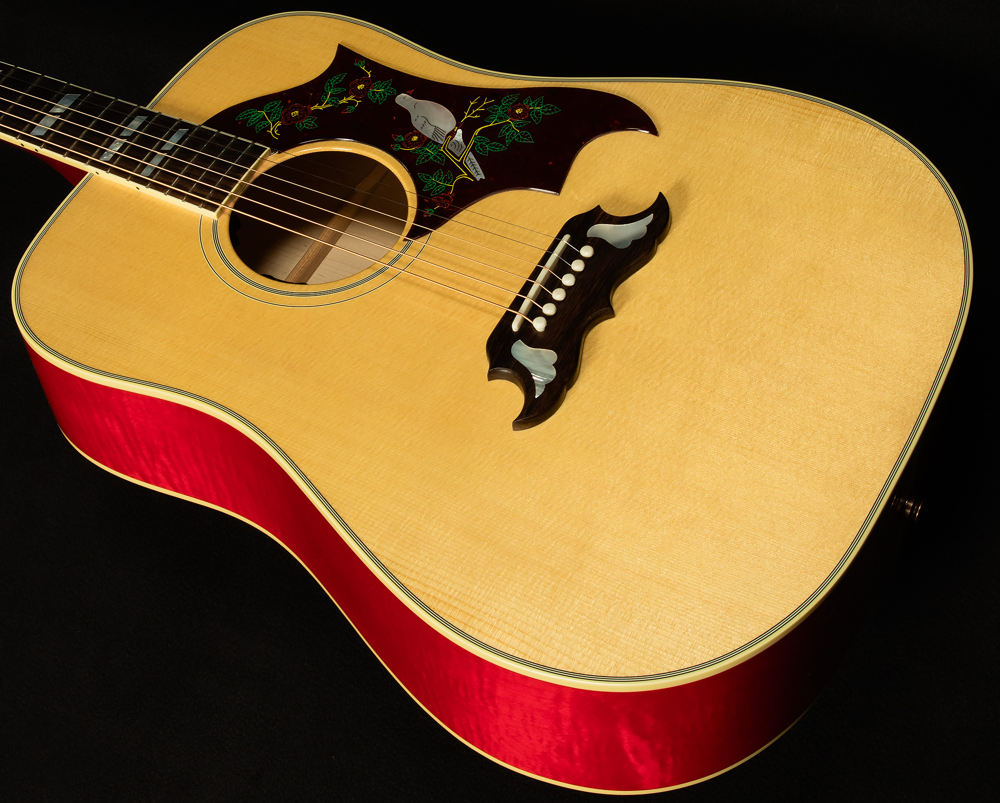 Wildwoodians, we are proud to present the Dove from Gibson's Original Collection of acoustics. Inspired by Gibson's top-of-the-line square-shoulder dreadnoughts of the sixties, the Dove Original is packed with opulent cosmetic appointments, and it has an inspiring voice that stands out in a crowd. Its spruce top and flamed maple back and sides give it a clear, crisp sound with tight lows, woody midrange, and sweet, sunny top-end chime. Also, its maple body helps give it exceptional note separation, string-to-string balance, and clarity. Furthermore, its 25.5-inch scale-length--longer than the typical 24.75-inch scale of most Gibsons--gives it a snappy, percussive, articulate attack.