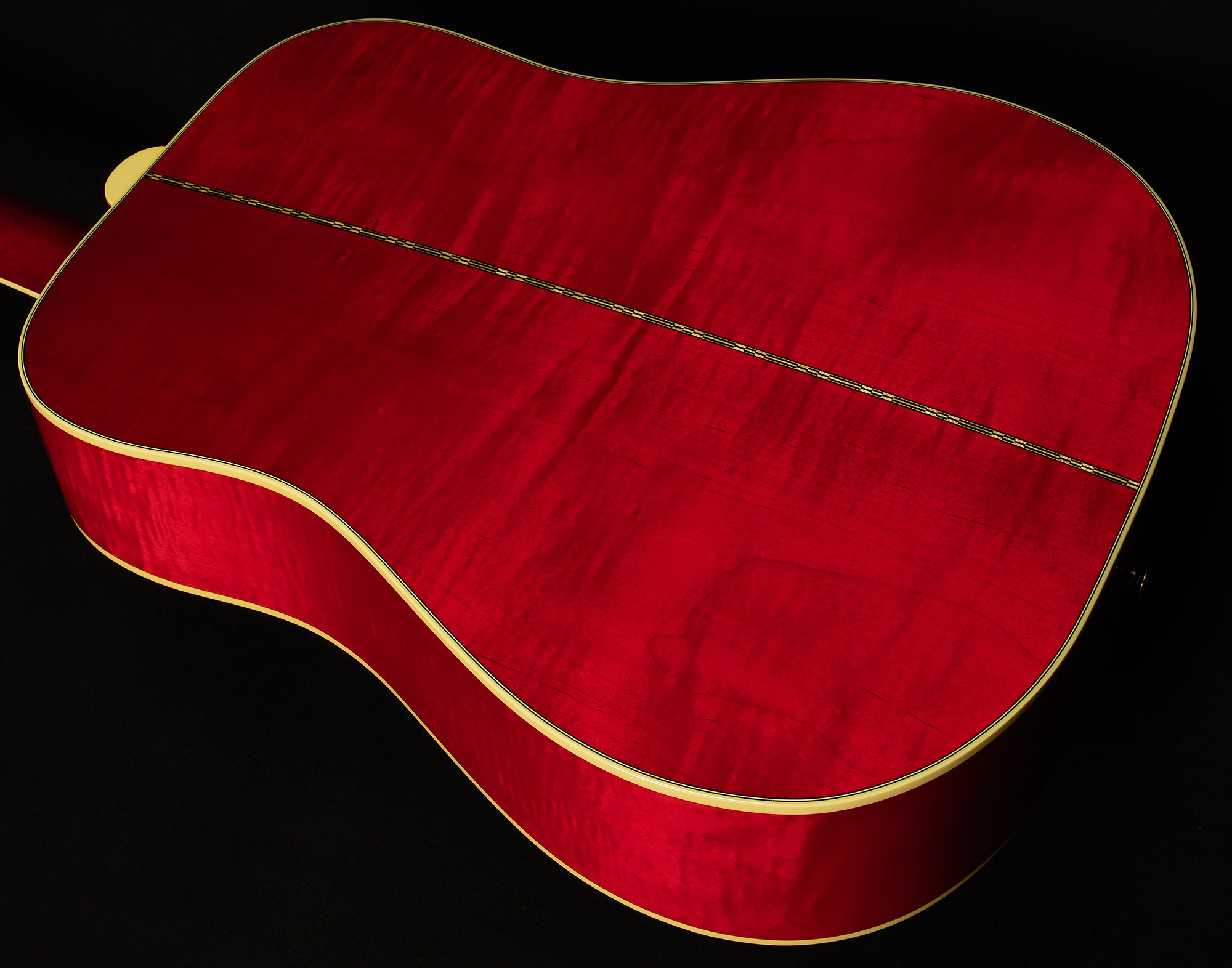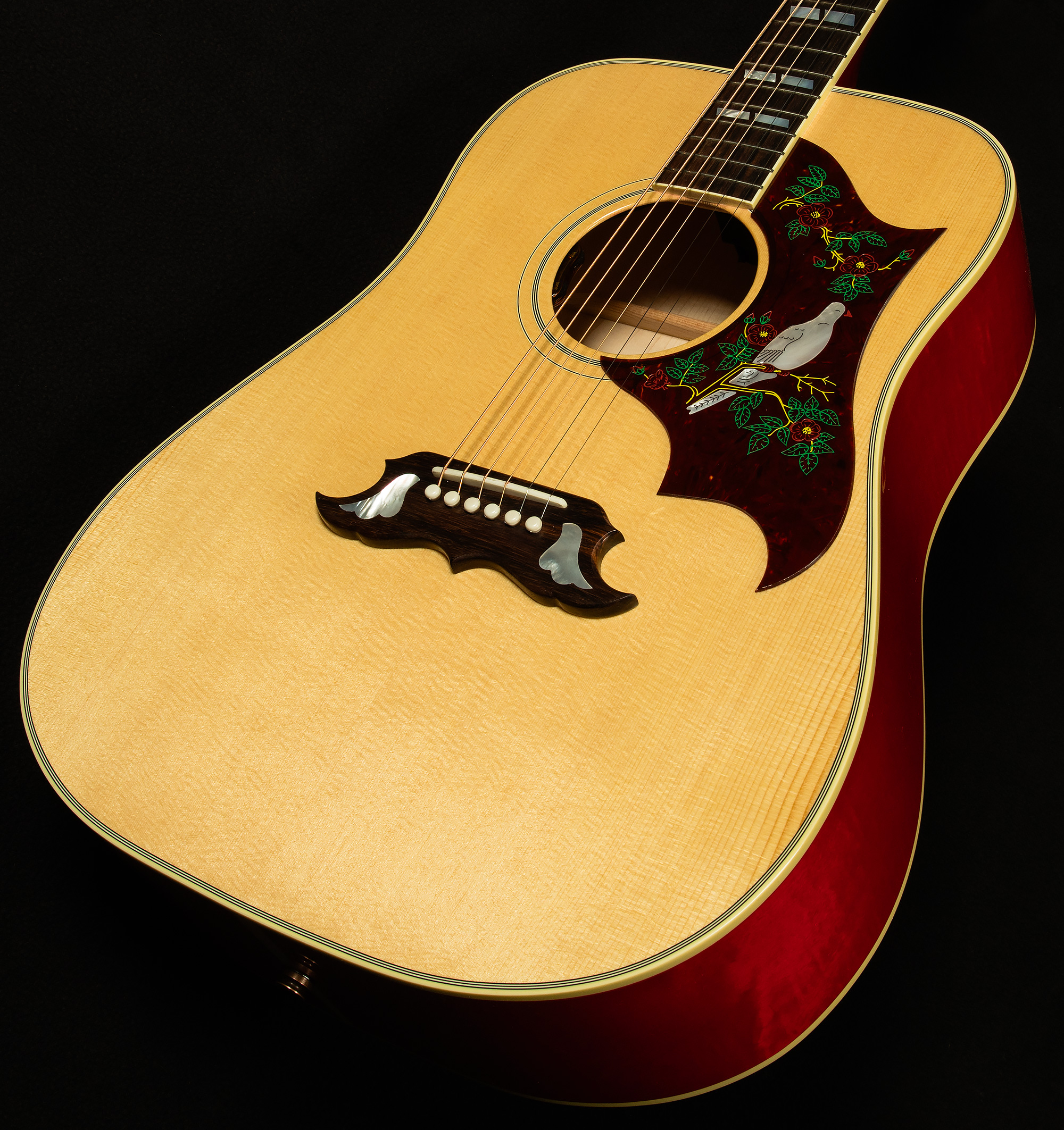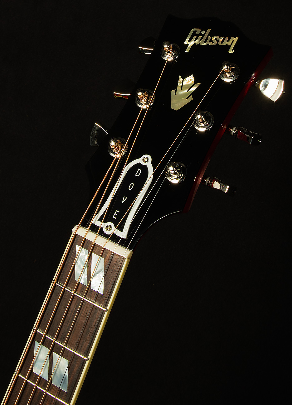 Wildwoodians, we are proud to present the Dove from Gibson's Original Collection of acoustics. Inspired by Gibson's top-of-the-line square-shoulder dreadnoughts of the sixties, the Dove Original is packed with opulent cosmetic appointments, and it has an inspiring voice that stands out in a crowd. Its spruce top and flamed maple back and sides give it a clear, crisp sound with tight lows, woody midrange, and sweet, sunny top-end chime. Also, its maple body helps give it exceptional note separation, string-to-string balance, and clarity. Furthermore, its 25.5-inch scale-length--longer than the typical 24.75-inch scale of most Gibsons--gives it a snappy, percussive, articulate attack.
