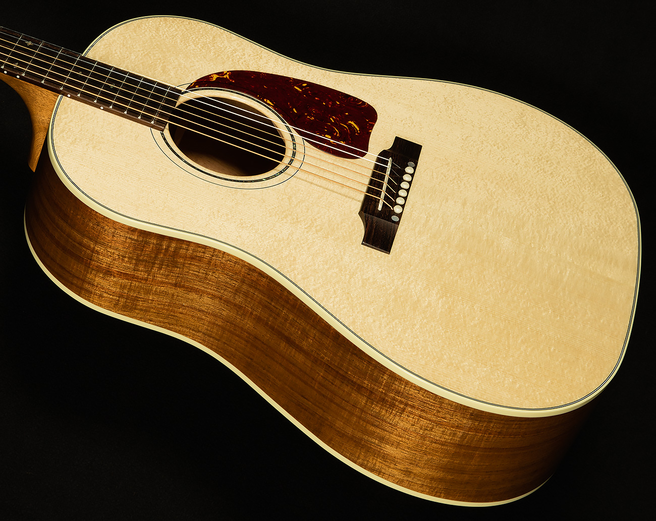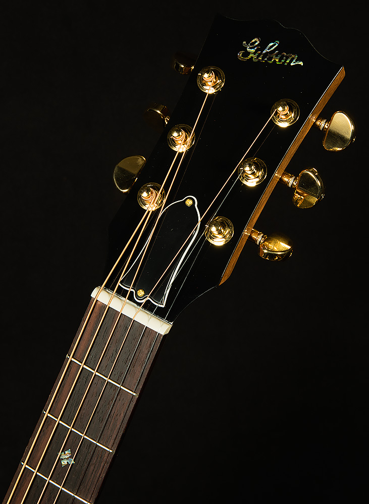 They pair a solid Englemann spruce with solid koa back and sides, and together those two premium tonewoods produce a sweet, nuanced sound resplendent with overtones. Gibson's luthiers attach the solid-wood body to the mahogany neck with a compound dovetail neck joint to maximize resonance and sustain.