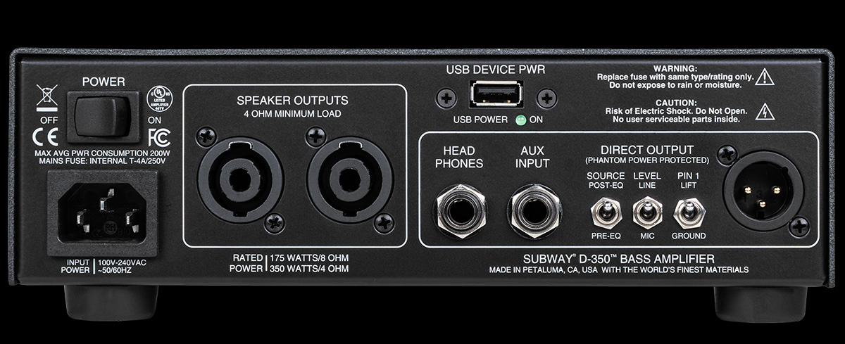 When you’re practicing at home, the Aux Input and Headphones output jacks let you listen to a media player and your bass simultaneously without disturbing others. The Subway D-350 also has a USB power port for powering accessories, while the fully-featured balanced XLR direct output (DI) with pre/post EQ source, ground lift, and Mic/Line level switches are perfect for delivering MESA’s legendary tone to the front-of-house PA or your recording system’s audio interface. A pair of SpeakOn jacks allow you to connect one or two speaker cabinets; the Subway D-350 is an excellent partner for MESA’s highly musical Subway Ultra-Lite cabinets.