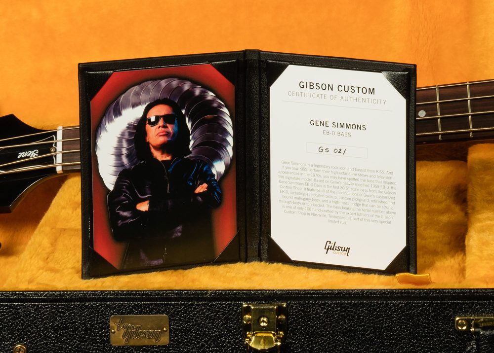 Gene Simmons is a legendary rock icon and bassist from KISS. And if you saw KISS perform their high-octane live shows and television appearances in the 1970s, you may have spotted the bass that inspired this signature model from Gene Simmons and Gibson Custom. Based on Gene’s heavily modified 1959 EB-0, the new Gene Simmons EB-0 Bass is the first 30.5” scale bass from the Gibson Custom Shop and the first bass the Custom Shop has produced in quantity. Gene made several modifications to his EB-0, including refinishing it, reshaping the neck to a custom profile, replacing the pickup with a later model Gibson unit and relocating it much closer to the bridge, installing a custom pickguard, adding binding, and changing the original tuners to Grovers. The bridge was also replaced with a high-mass model and can now be strung through-body or as a top-loaded bridge. All of these details are faithfully represented in the new Gibson Custom Gene Simmons EB-0 Bass. A custom hardshell case is also included.