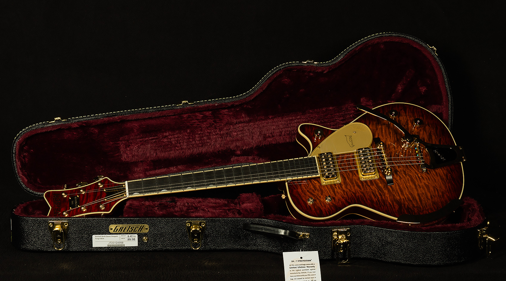 The G6134TGQM-59 features a highly figured quilt maple top with chambered mahogany body, which magnifies harmonic richness by letting air resonate between the top and body for livelier and more articulate tone. Finished in nitrocellulose lacquer the G6134TQM-59’s beautifully figured top is further enhanced by the stunning Forge Glow finish, while the body is accentuated with a rich mahogany stain, making for a refined contrast that’s brimming with classic Gretsch style and vibe.